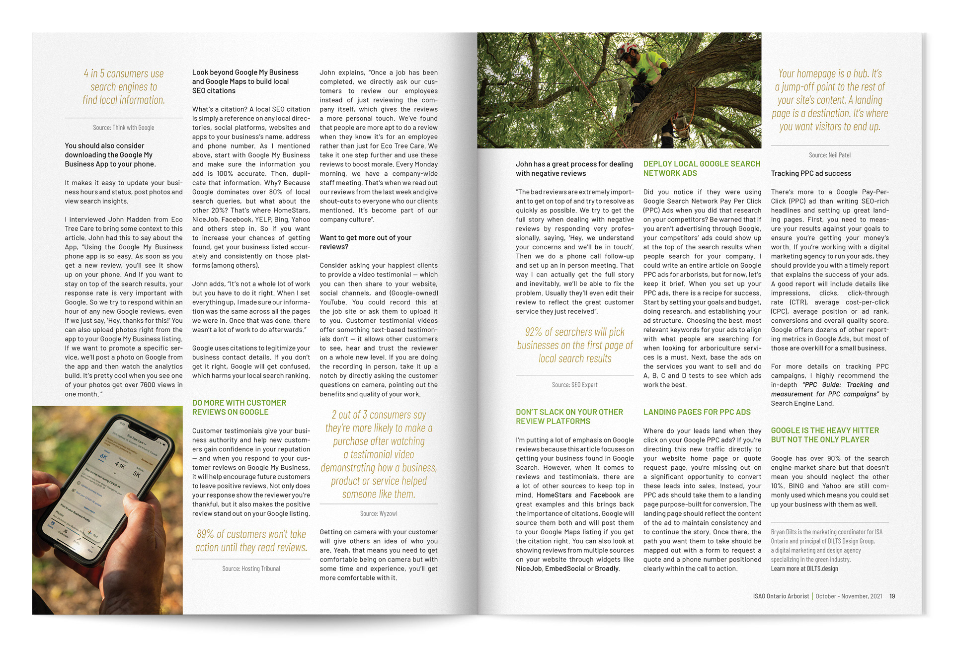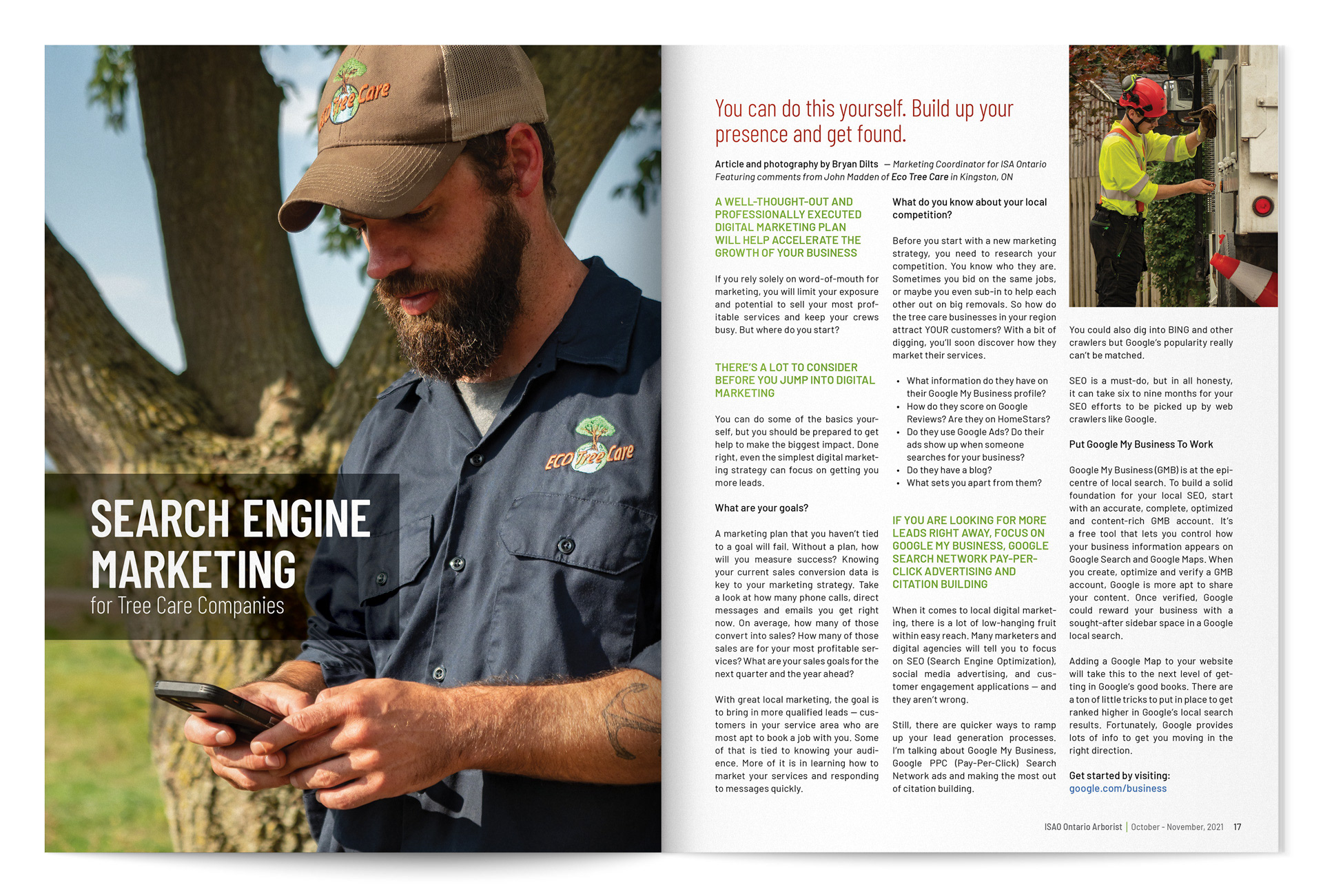 The second article I authored for Ontario Arborist was the first installment in a series titled "Digital Marketing Basics for Tree Care Businesses." This initial piece focused on building a strong presence on the Google Search Network. To make the content more relevant and practical for the ISAO member base, I interviewed and photographed the team at Eco Tree Care in Kingston, ON, providing real-world examples that illustrated the strategies discussed in the article.
