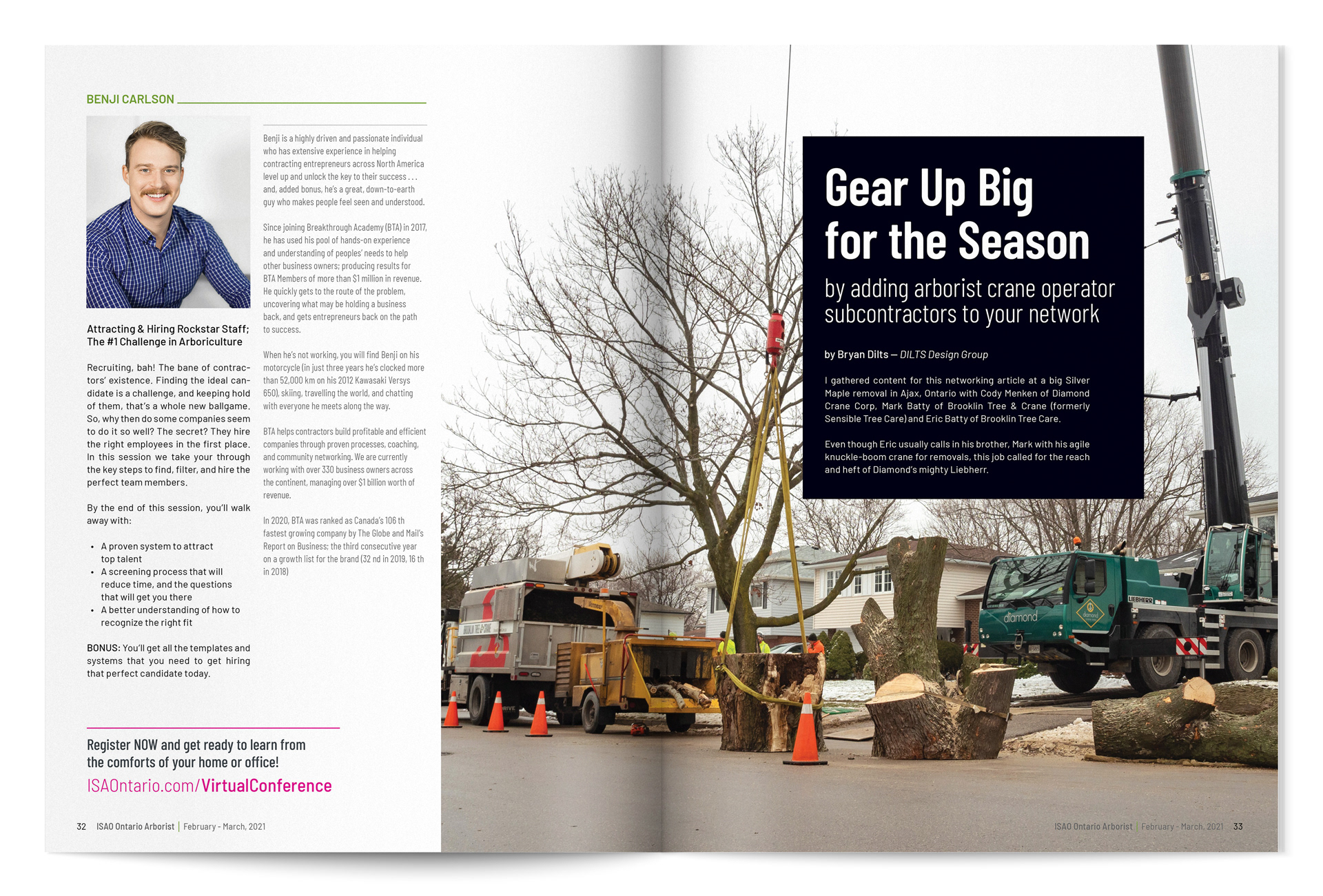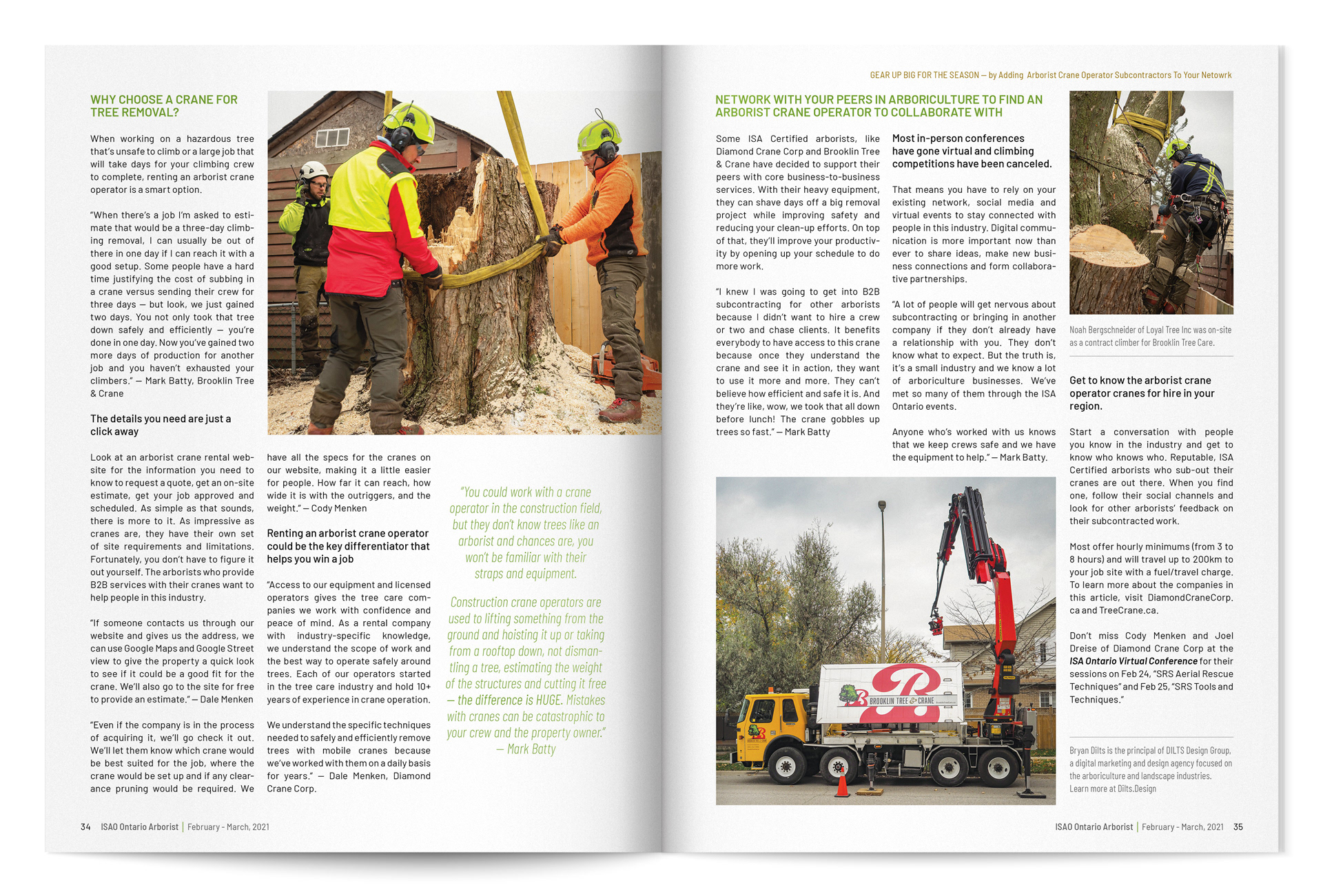 I authored my first article for Ontario Arborist in the February/March 2021 issue, titled "Gear Up Big For The Season by Adding Arborist Crane Operator Subcontractors to Your Network." For this piece, I interviewed experts from Diamond Crane Corp and Brooklin Tree & Crane, gaining insights into their operations. I also captured on-site photographs during a job in Ajax, Ontario, where the teams collaborated to remove a large Silver Maple, adding a visual element to the story that highlighted the scale and expertise involved in the work.
