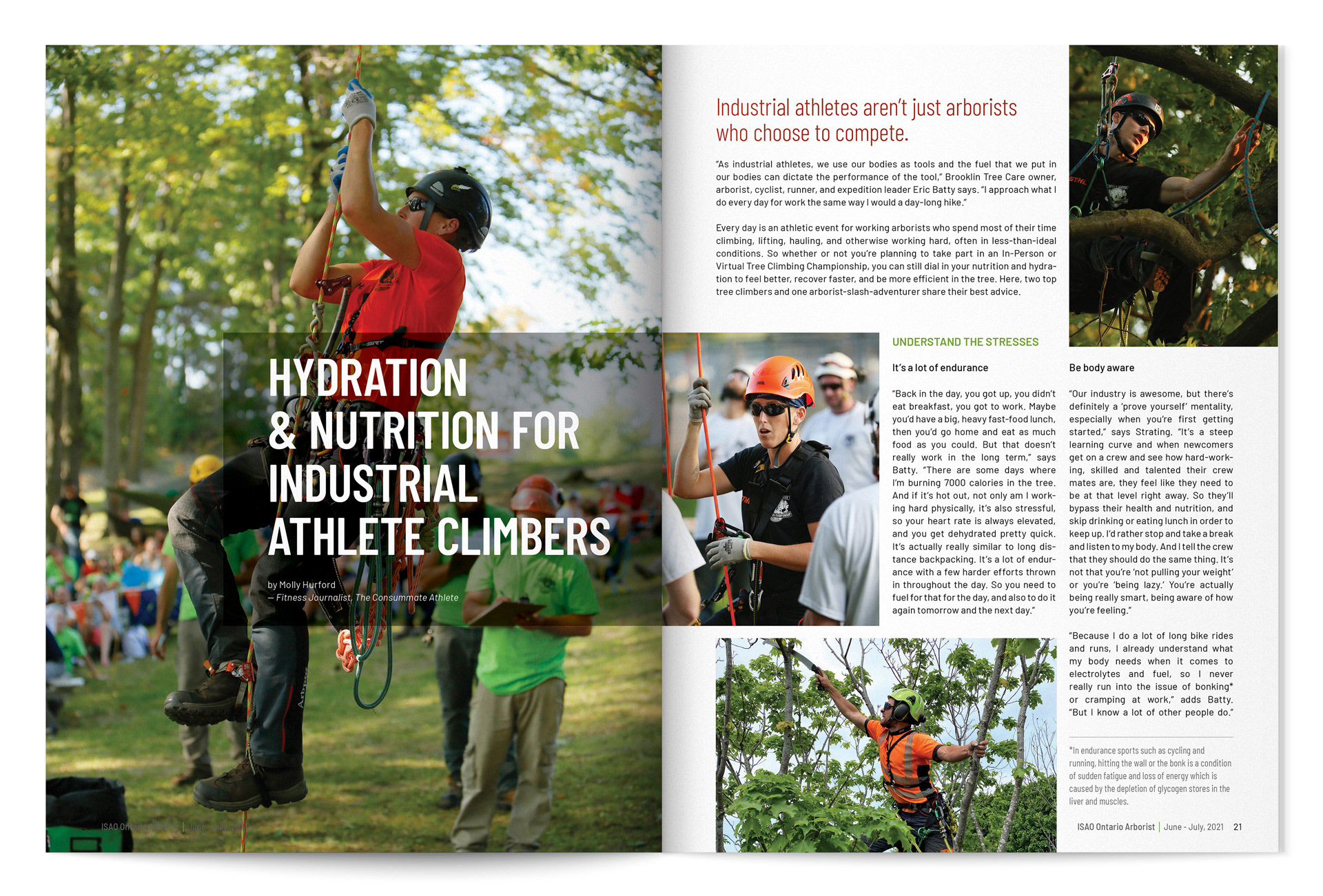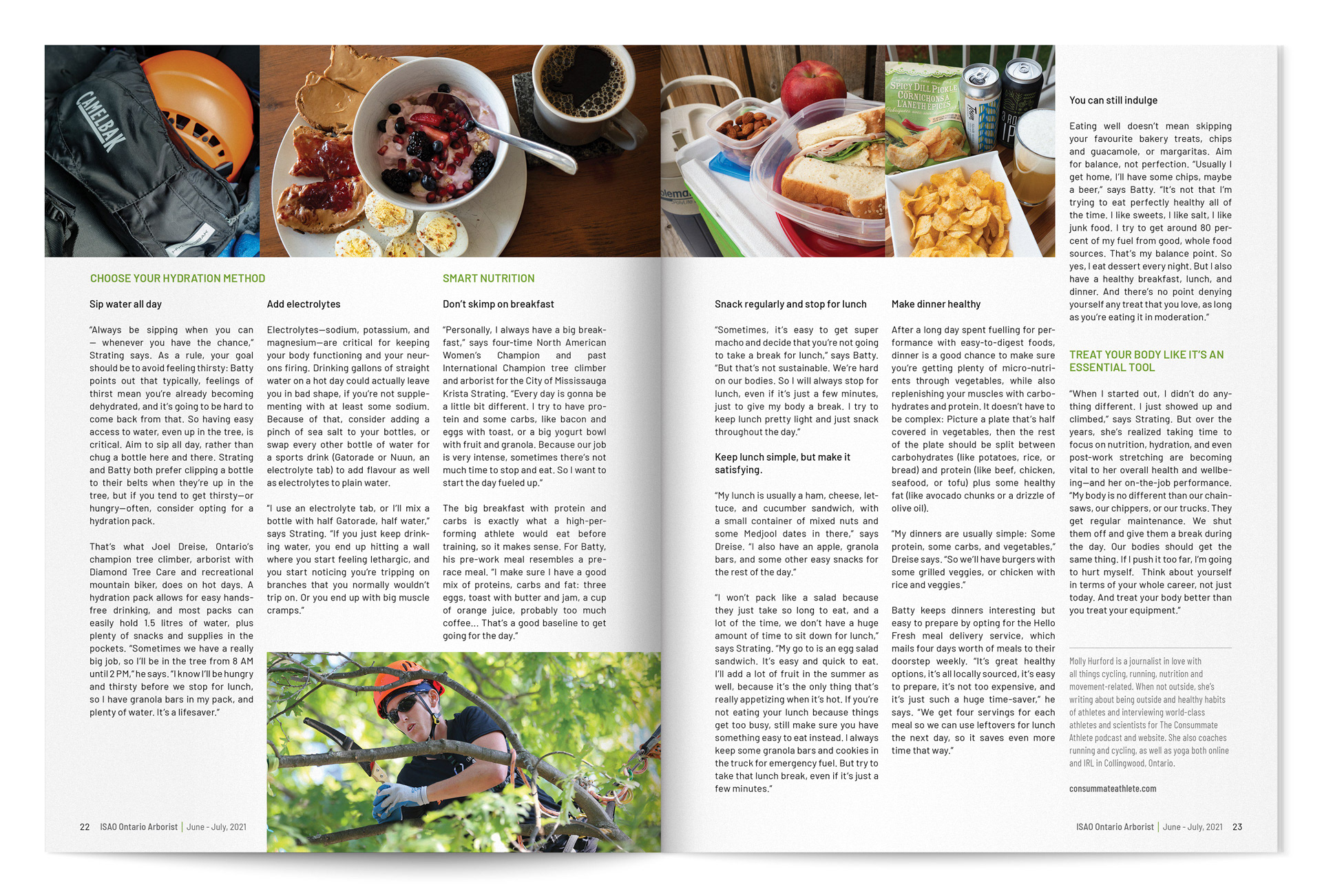 While developing the content calendar for Ontario Arborist, I identified a gap in health and wellness topics relevant to our readers. To address this, I reached out to sports author and coach Molly Hurford for the June/July 2021 issue. I arranged for Molly to interview three of Ontario’s top industrial athlete climbers, bringing valuable insights into their physical and mental conditioning. To complement the article, I sourced photos of the arborists from the ISAO climbing competition archives and personally shot the nutrition-related photos, ensuring the visual content aligned with the article's focus on health and performance.