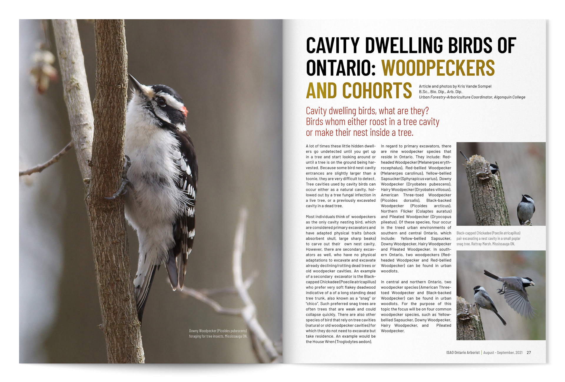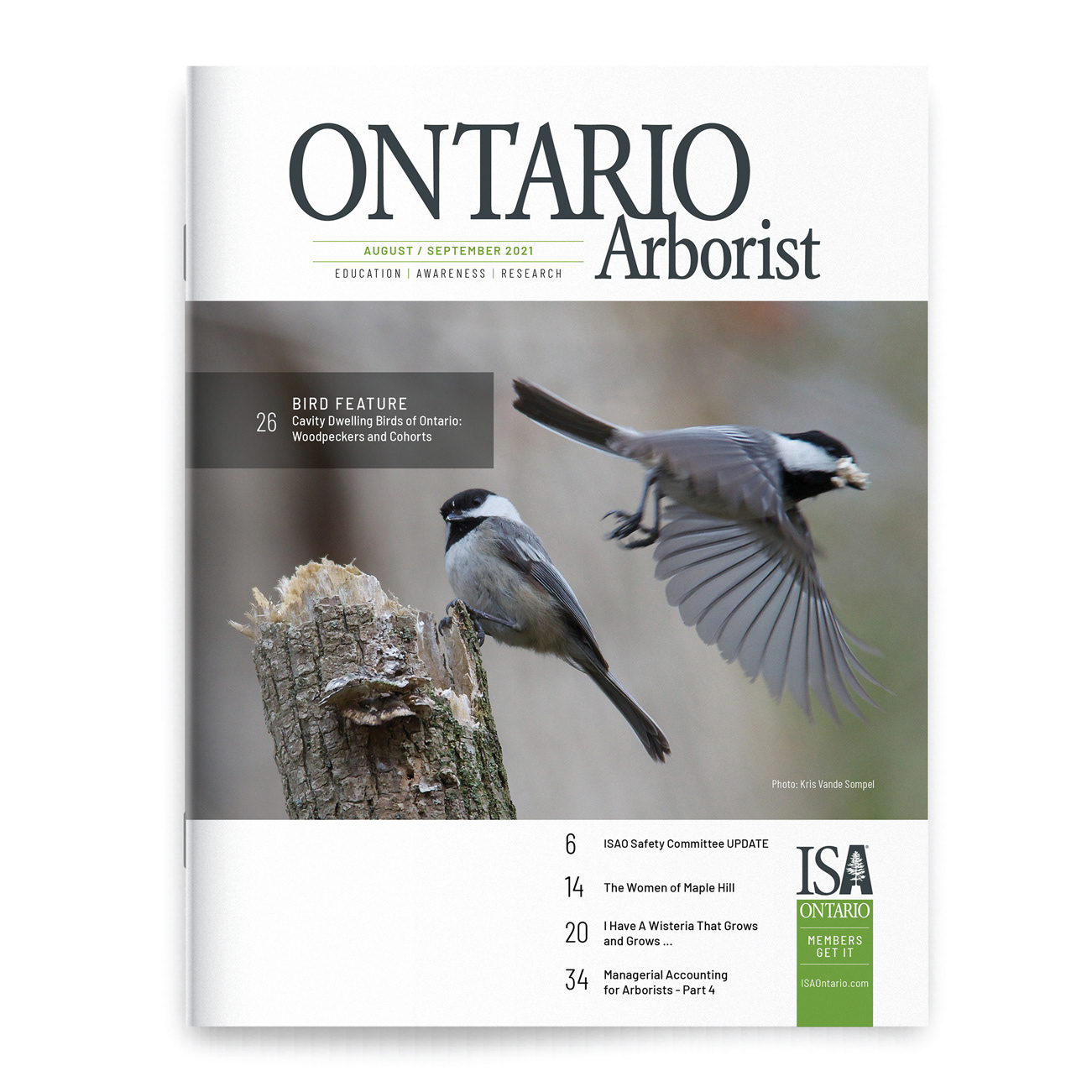 For the August/September 2021 issue of Ontario Arborist, the executive director of ISAO, Rebecca Lord, suggested a feature on cavity-dwelling birds of Ontario. We collaborated with Kris Vande Sompel, the Urban-Forestry-Arboriculture Coordinator at Algonquin College, who authored an insightful article on the topic. Kris also contributed stunning photographs from his personal collection, adding a visually captivating element to the feature that enriched our readers' understanding and appreciation of these unique species.