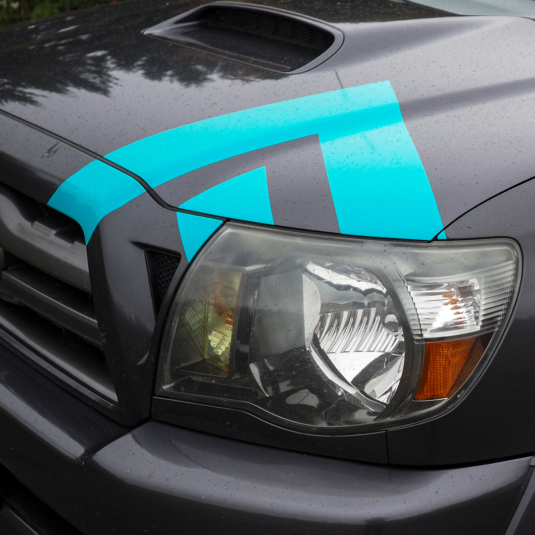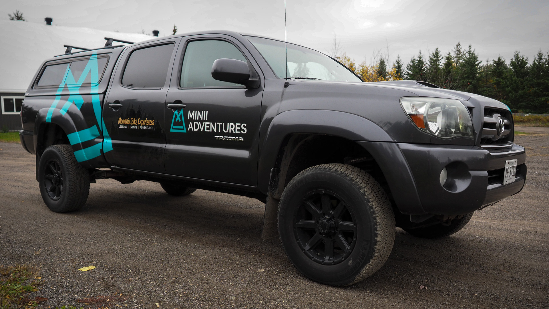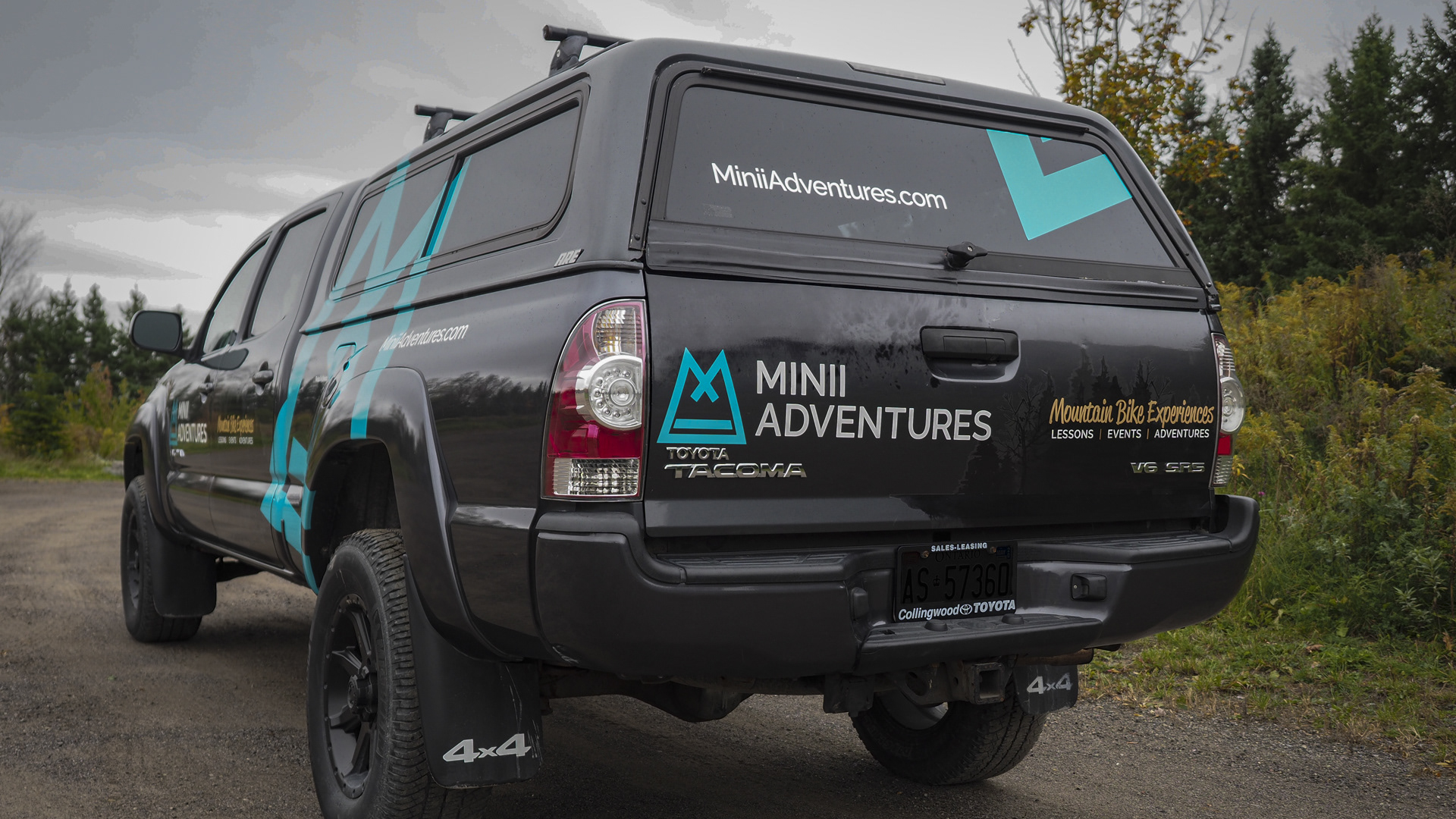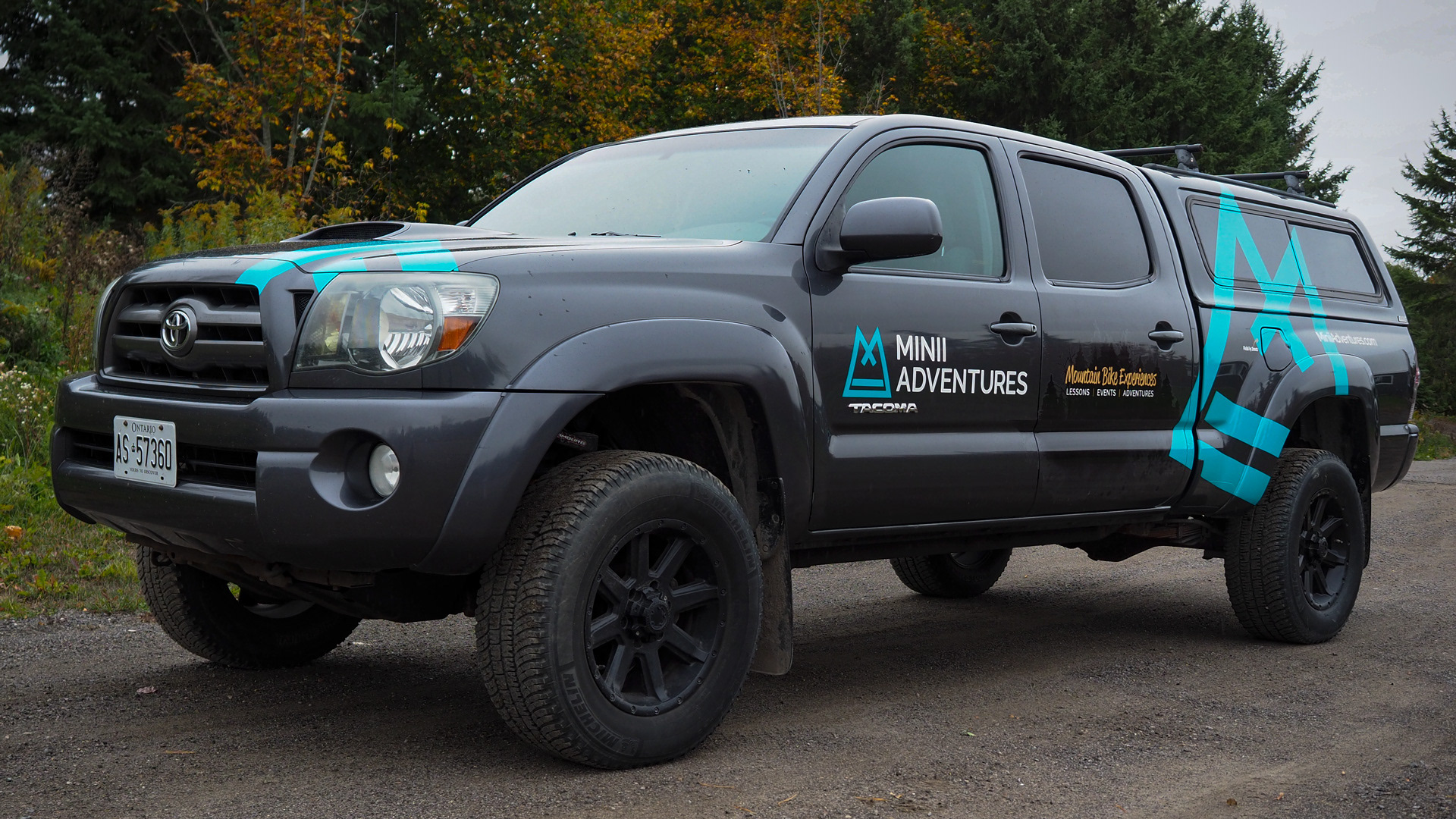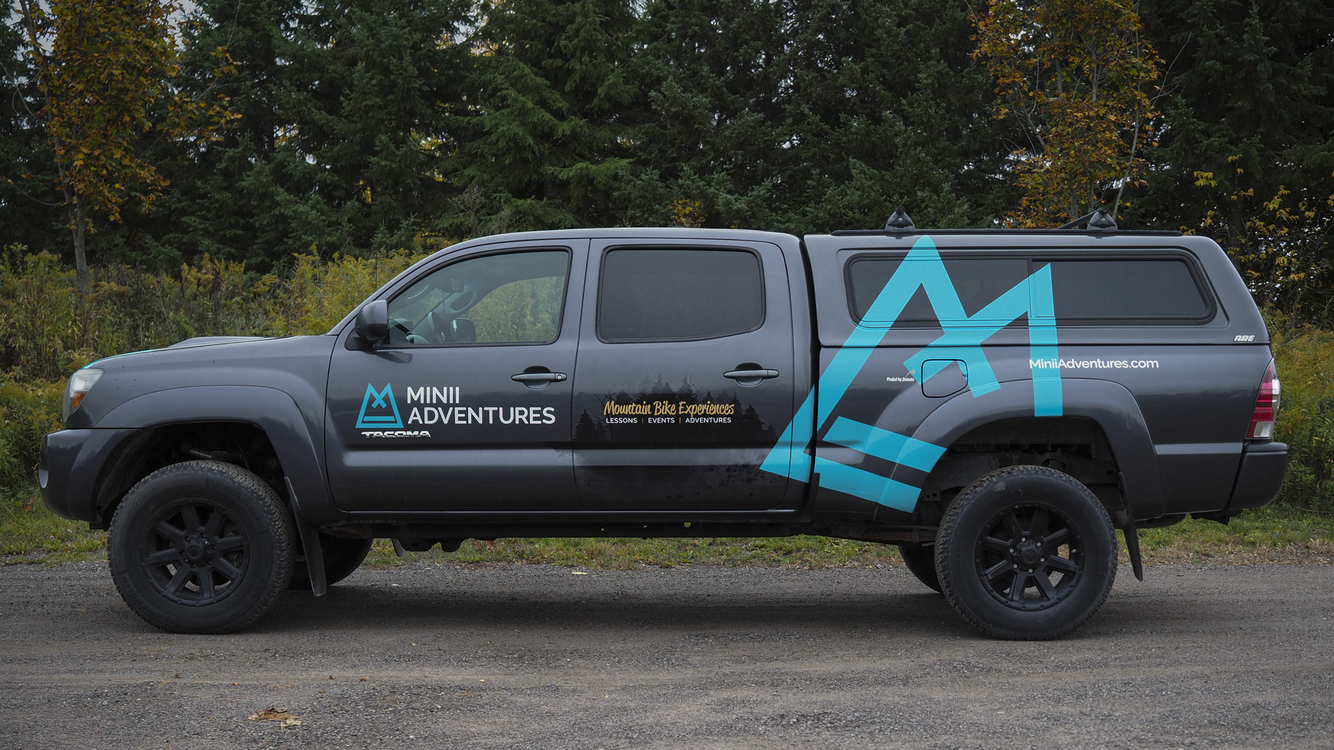 Charlotte Batty of Minii Adventures had her branding well established when she approached me for help. Her logo, color palette, and messaging were all solid. What she needed was a way to bring that strong brand identity to life on her cycling jerseys and Toyota Tacoma pickup. Designing the truck was a fun project. Instead of using a full vehicle wrap, I opted for decals to keep costs down while still achieving a striking design. I layered graphics, applying a sumi-e black ink illustration of a forest scene on clear vinyl to add depth and atmosphere. Enlarging the glyph and setting it at an angle gave the truck a dynamic look, making sure it stands out at the trailhead and turns heads wherever it goes.