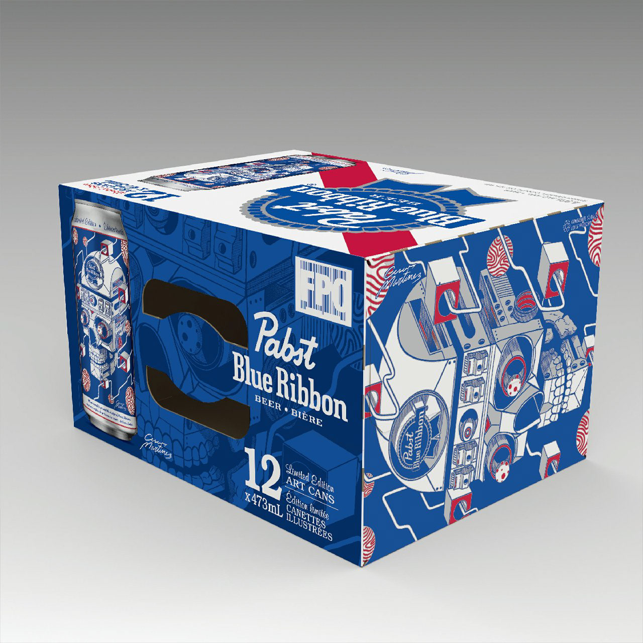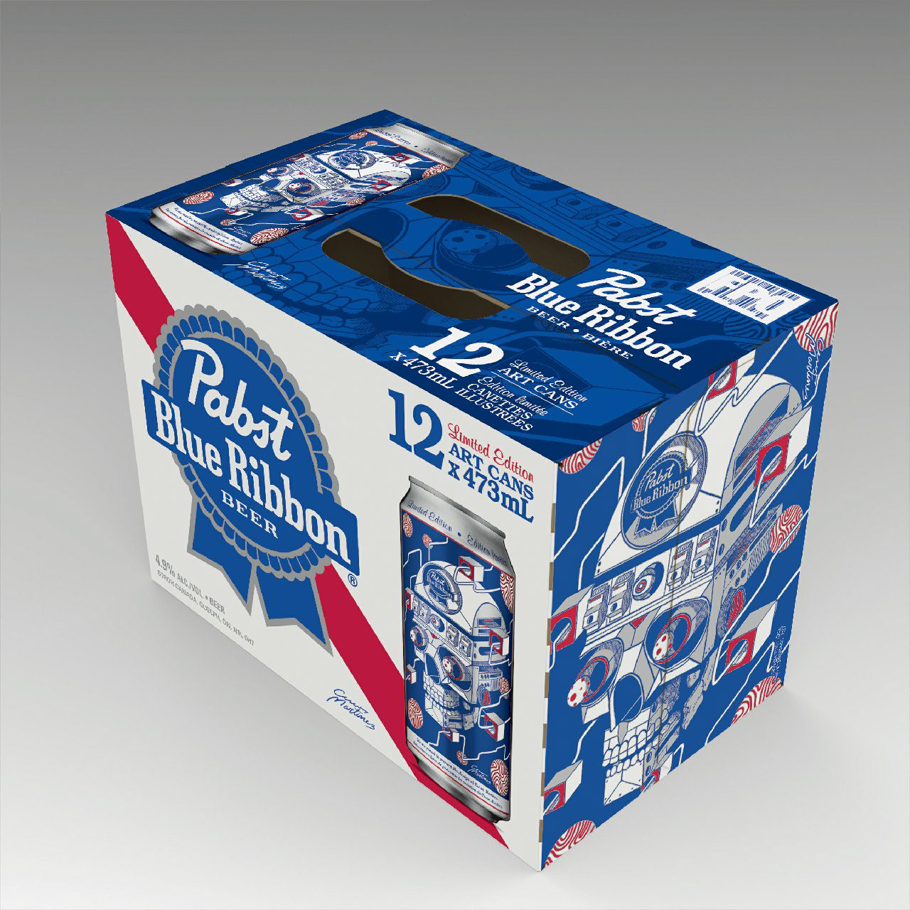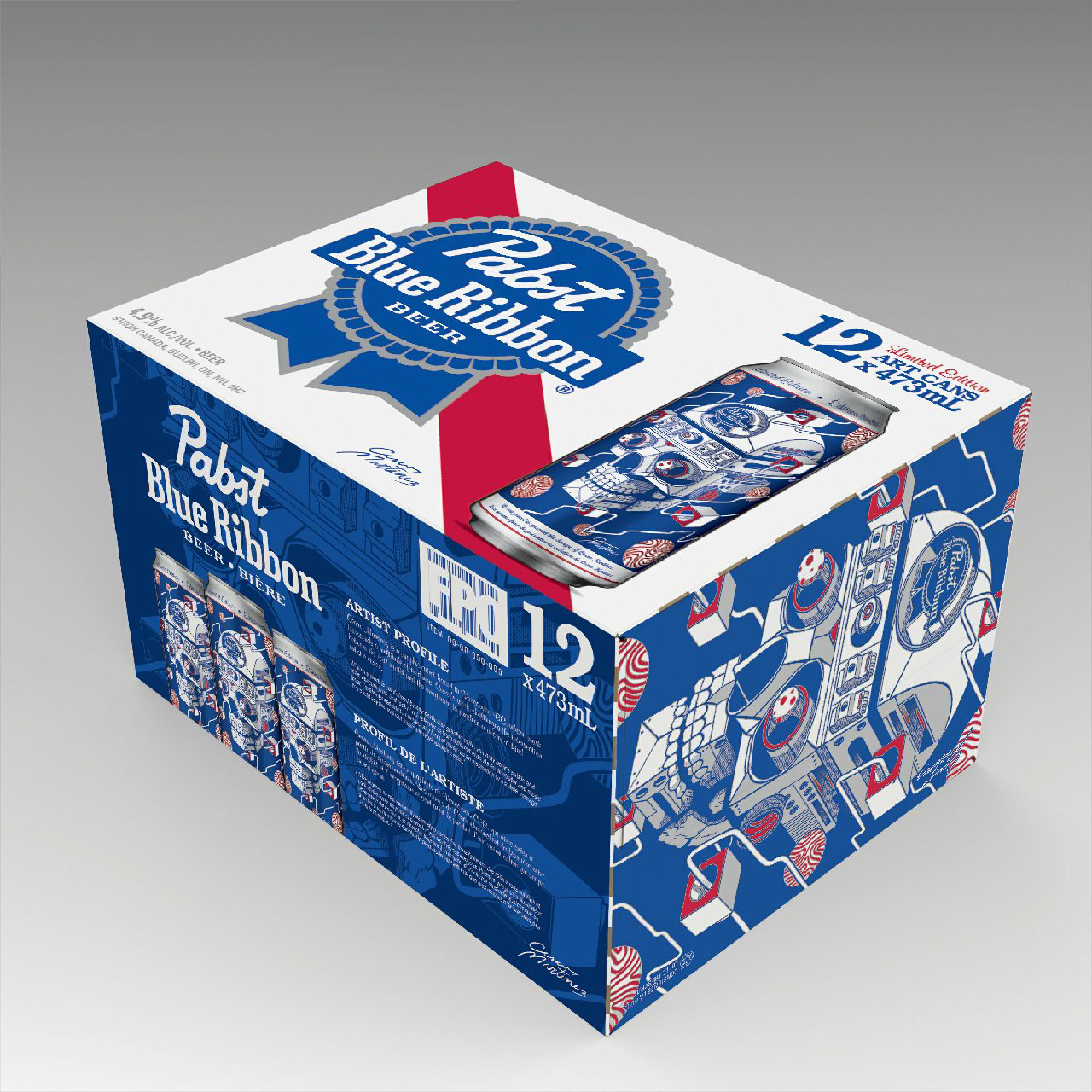 Pabst Blue Ribbon commissioned artists to create illustrations for a series of limited edition 473mL cans. My role was to creatively integrate these unique artworks into the packaging design. To give the illustrations prominence and attract attention on the shelf, I featured them prominently on the end panels. I also transformed the artwork into duo-tones for the handle and bottom panels, ensuring cohesive branding throughout the packaging.